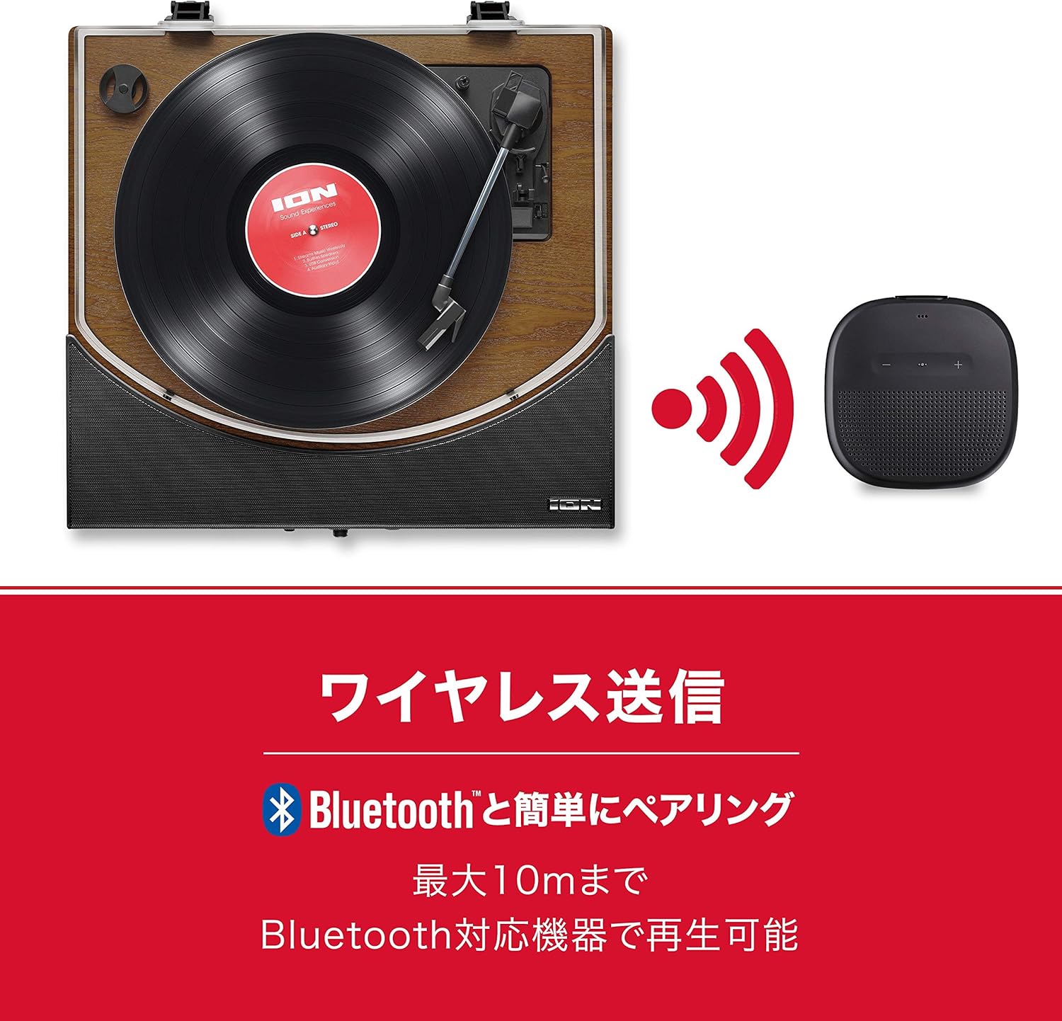 無線のBluetoothスピーカーが1つあれば、煩わしい配線なしで、好きな場所でレコードを楽しめます。